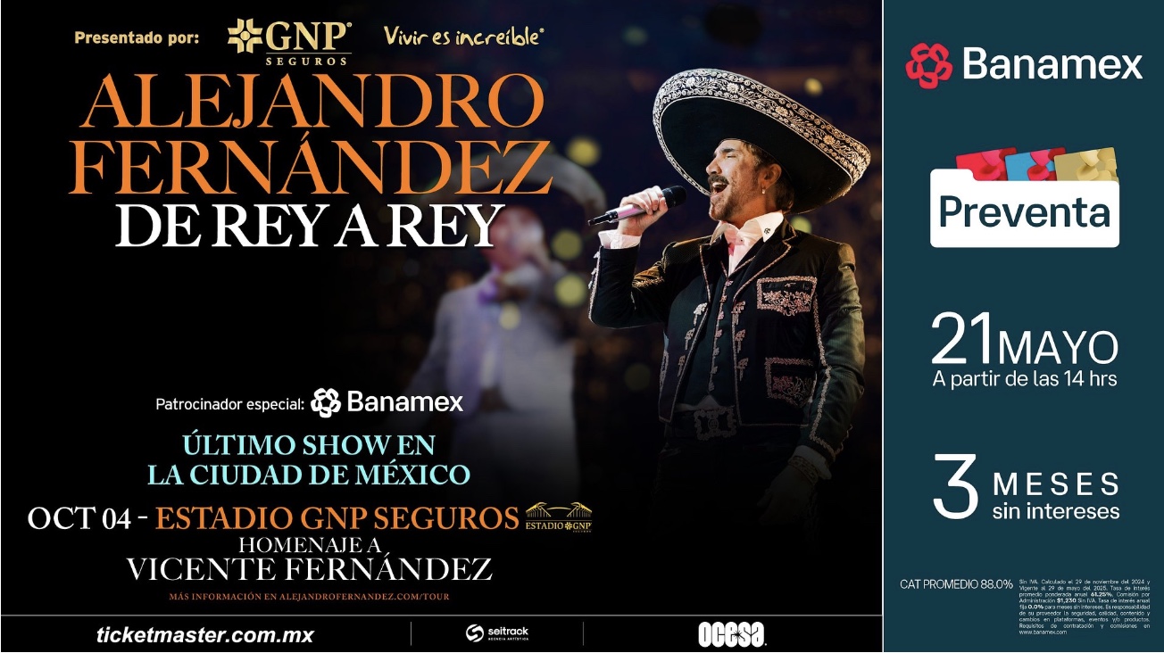 De Rey a Rey, el homenaje a una de las figuras más importantes del país, Vicente Fernández, en voz de su hijo Alejandro Fernández, ahora en el Estadio GNP Seguros. Podrás adquirir los boletos en preventa Banamex el 21 de mayo y, un día después, a través de la venta general en las taquillas de los inmuebles o en www.ticketmaster.com.mx.