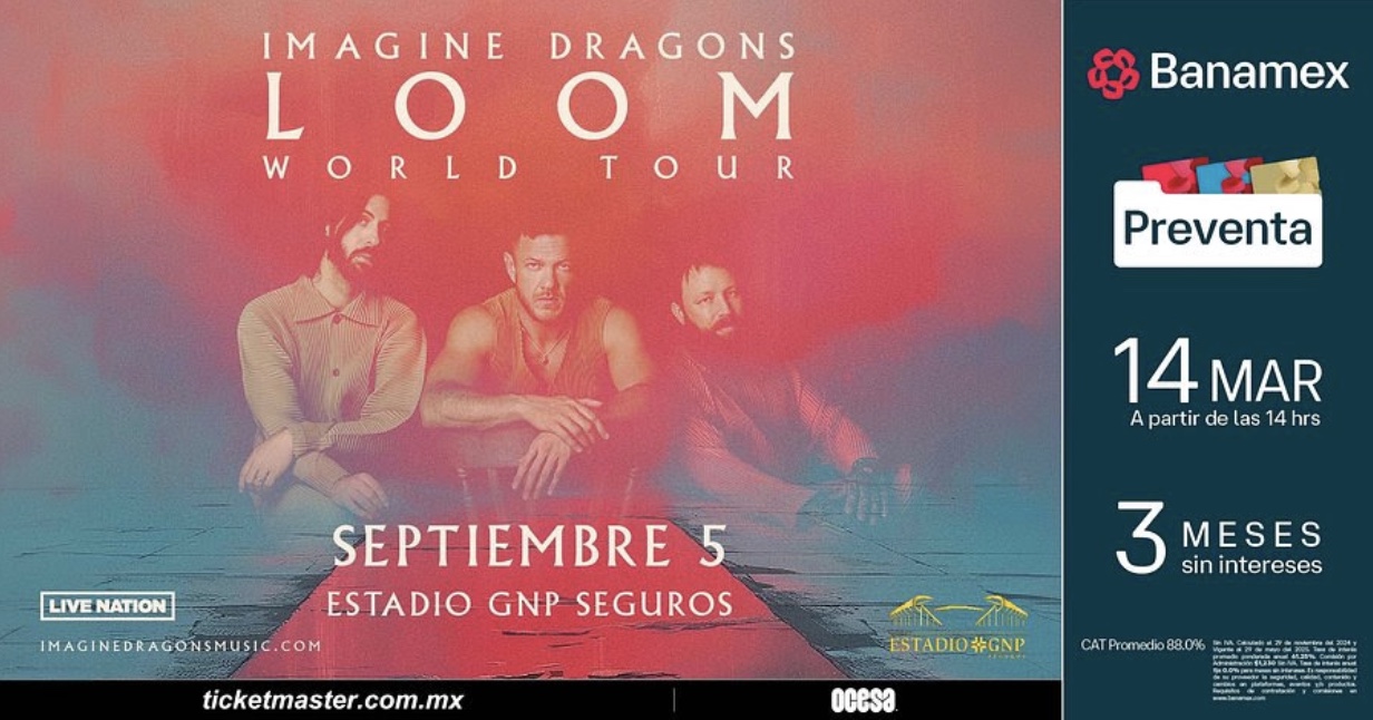 a banda multiplatino ganadora del Grammy, Imagine Dragons, anuncia su gira mundial LOOM World Tour en México. Esta gira celebra el lanzamiento de su aclamado álbum LOOM y marca su muy esperado regreso al Estadio GNP Seguros en la Ciudad de México el 5 de septiembre.