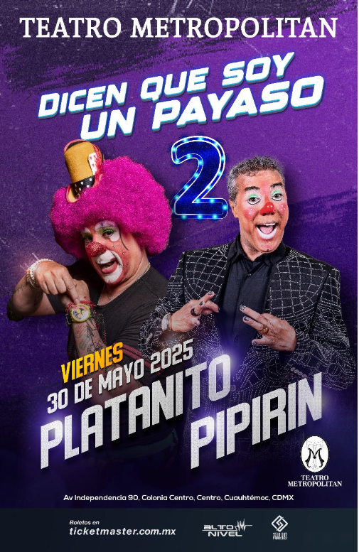 Los boletos para el espectáculo “Dicen que Soy un Payaso 2” ya están disponibles a través del sistema Ticketmaster y en las taquillas del Teatro Metropolitan. El espectáculo “Dicen que Soy un Payaso 2” no solo será una oportunidad para reír, sino también para celebrar la trayectoria de dos de los comediantes más queridos de México. Con su humor característico, su capacidad para improvisar y su conexión única con el público, Platanito y Pipirín están listos para ofrecer una noche que quedará grabada en la memoria de todos los asistentes.