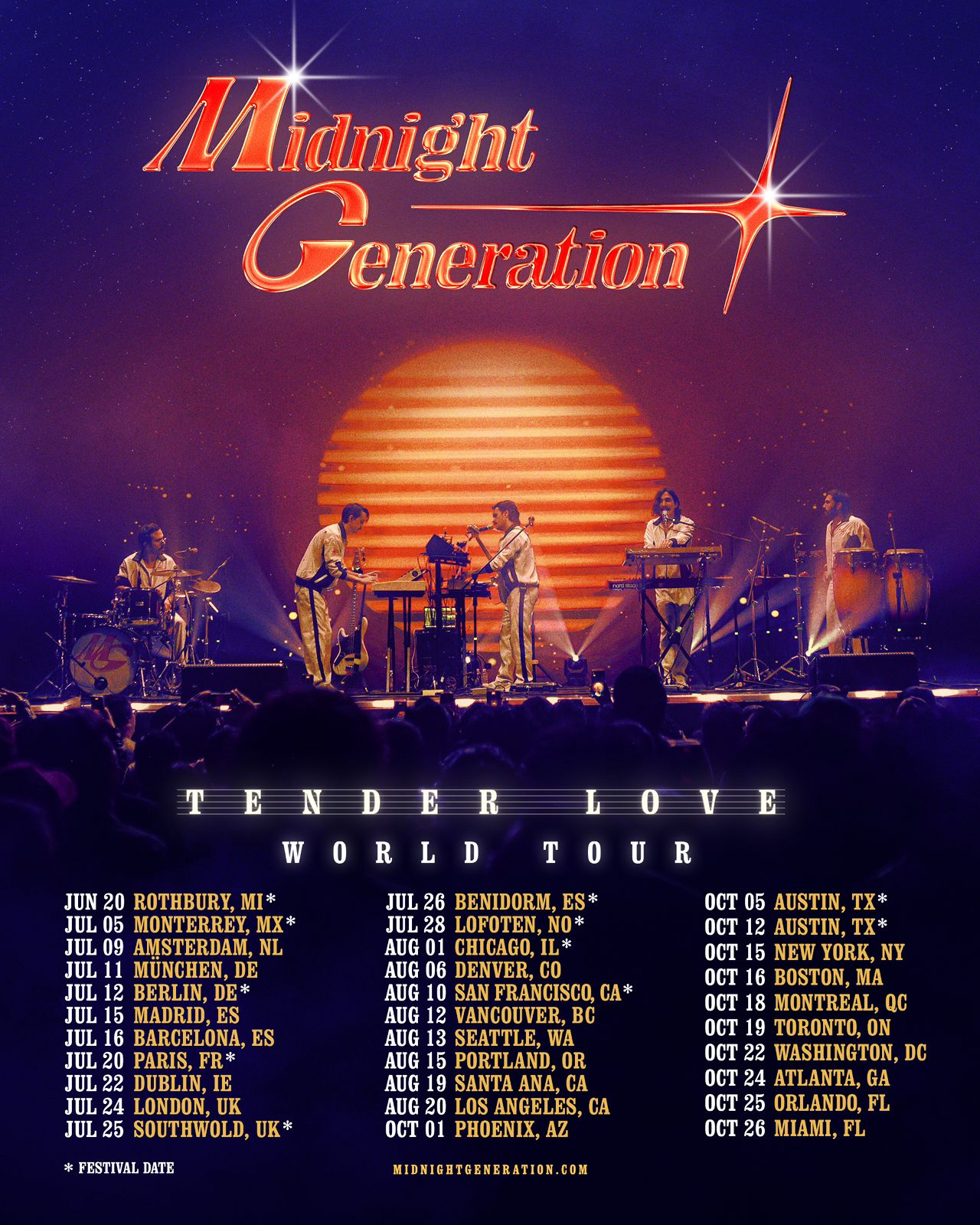 A poco tiempo de haber lanzado su tan esperado álbum Tender Love, la agrupación mexicana de electro-funk Midnight Generation, que ha venido causando sensación desde hace varios años en México y Latinoamérica y a lo largo de todo el planeta desde inicios de este año, anuncia su primera gira mundial: Tender Love World Tour, que los llevará a recorrer Europa, Estados Unidos, Canadá y el Reino Unido durante el verano y otoño de este año. Puede consultar la ruta completa y la información de venta de boletos más abajo.