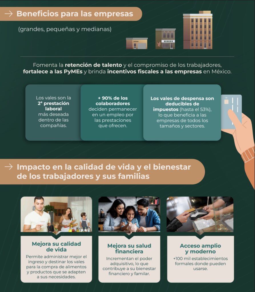De acuerdo a un informe sobre el impacto económico y social de la emisión de los vales de despensa en México, actualmente, afirma que esta prestación permite a las empresas generar ahorros en nómina por más de $18 mil millones de pesos anuales. Asimismo, permite a las empresas deducir hasta el 53% del monto otorgado en la declaración anual de impuestos.
